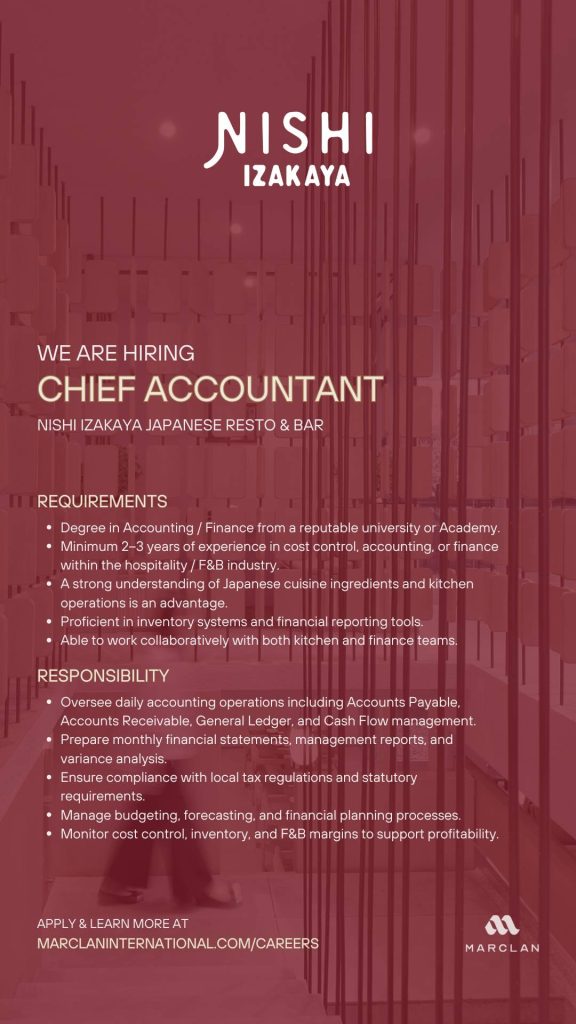 • Minimum 2–3 years experience in cost control, accounting, or finance within hospitality/F&B industry