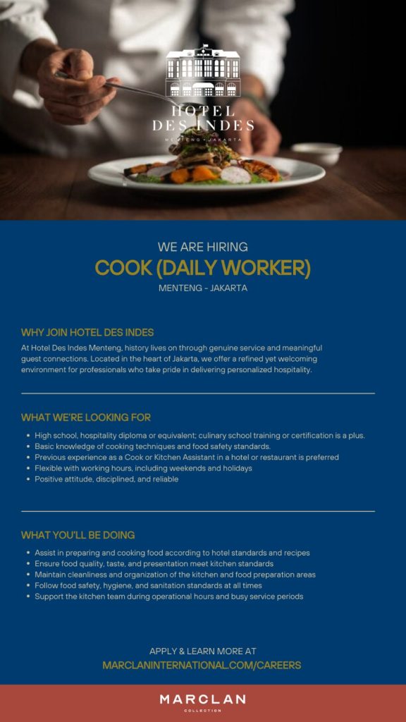 • Previous experience as a Cook or Kitchen Assistant in a hotel or restaurant is preferred